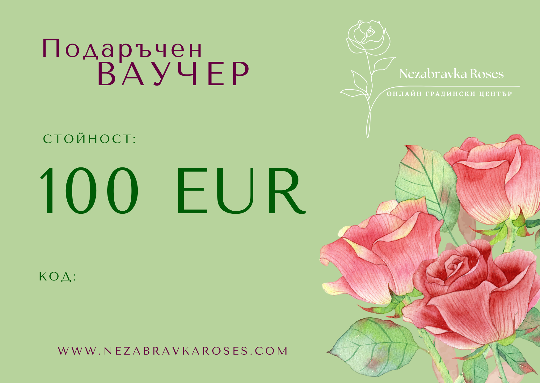 Незабравка Рози предлага подаръчен ваучер за закупуване на продукти от нашия онлайн магазин. Избере стойност, добавете в количката и завършете поръчката. Щом я обработим, ще ви се обадим за уточнение по плащането.